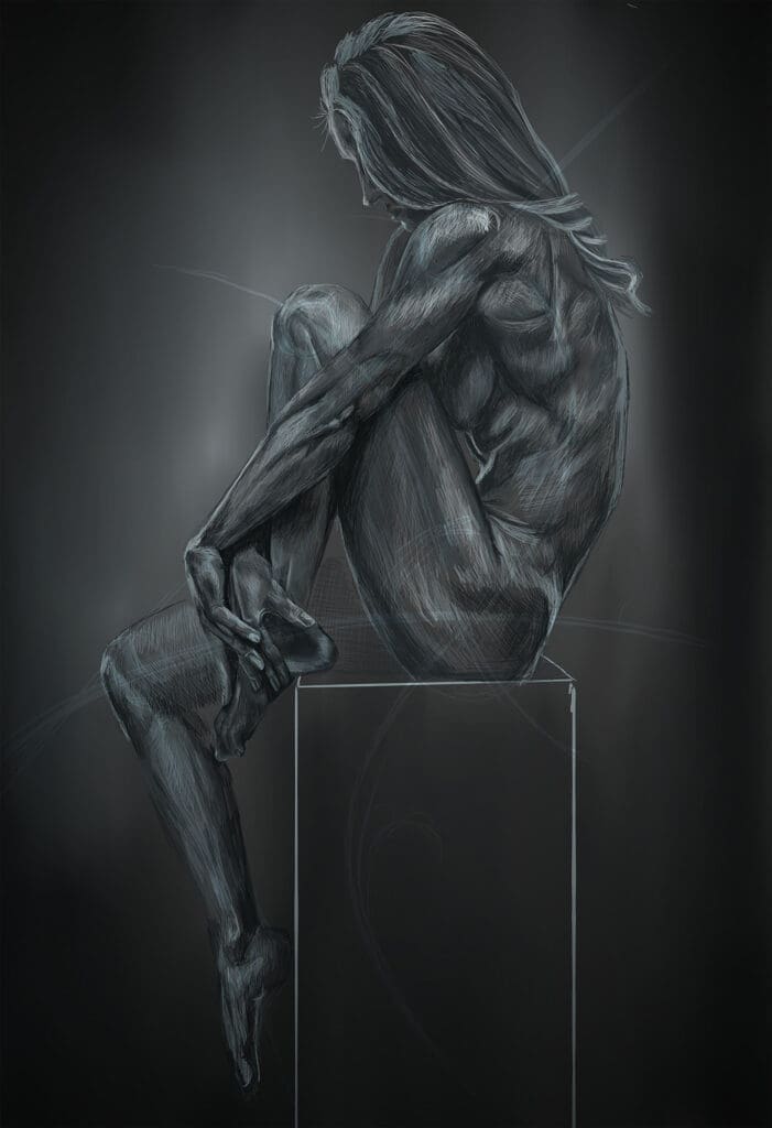 Introducing "Contemplation," a captivating digital painting that will add a touch of sophistication to your home decor. This stunning black and white figure drawing depicts a fit woman sitting on a pedestal, clutching one knee, and looking pensive. The artwork is created by the talented Mike Munoz, a digital artist from Tucson, Arizona.